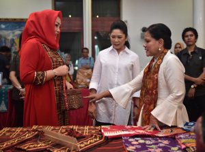 Ibu Iriana Jokowi mengunjungi stand pameran sandang kerajinan serta peragaan busana adat Kabupaten OKU Selatan Provinsi Sumatera Selatan didampingi Ibu Isyana Popo dan Ibu Febi Herman deru