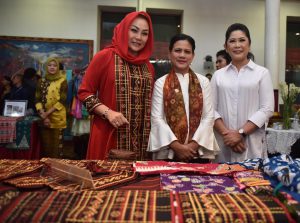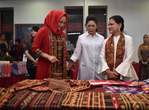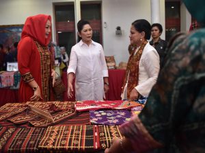 Ibu Iriana Jokowi mengunjungi stand pameran sandang kerajinan serta peragaan busana adat Kabupaten OKU Selatan Provinsi Sumatera Selatan didampingi Ibu Isyana Popo dan Ibu Febi Herman deru