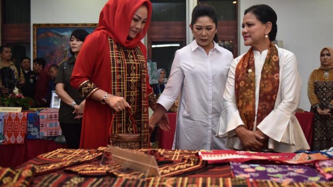 Dalam kesempatannya, Ibu Iriana Jokowi mengunjungi stand pameran sandang kerajinan serta peragaan busana adat Kabupaten OKU Selatan Provinsi Sumatera Selatan didampingi Ibu Isyana Popo dan Ibu Febi Herman deru