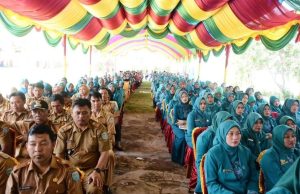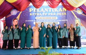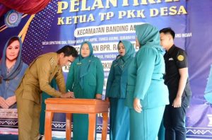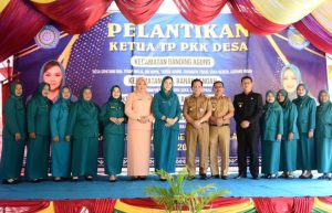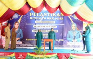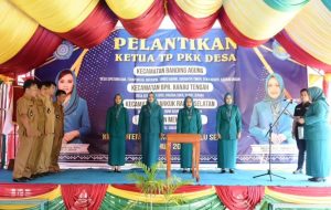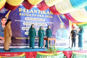 Ketua Tim Penggerak PKK Kabupaten Ogan Komering Ulu Selatan (OKUS), Isyan Lonitasari Popo menghadiri pelantikan Ketua TP PKK Desa Kecamatan Banding Agung, BPR Ranau Tengah, Warkuk Ranau Selatan, dan Mekakau Ilir di halaman Kantor Camat Banding Agung.